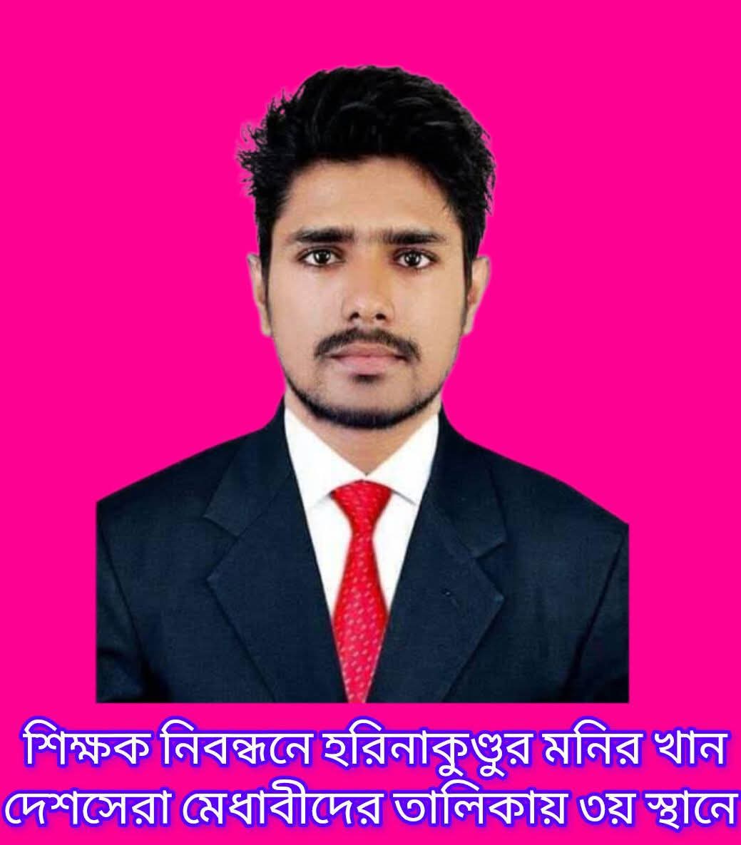 ১৮তম শিক্ষক নিবন্ধন পরীক্ষায় স্কুল পর্যায়ে জাতীয় মেধা তালিকায় তৃতীয় স্থান অর্জন করার গৌরব অর্জণ করেছেন ঝিনাইদহের হরিনাকুণ্ডুর কৃতি সন্তান মনির খান। সহকারী শিক্ষক (বাংলা) পদে অংশ নিয়ে তিনি এই গৌরবময় সাফল্য অর্জন করেন।